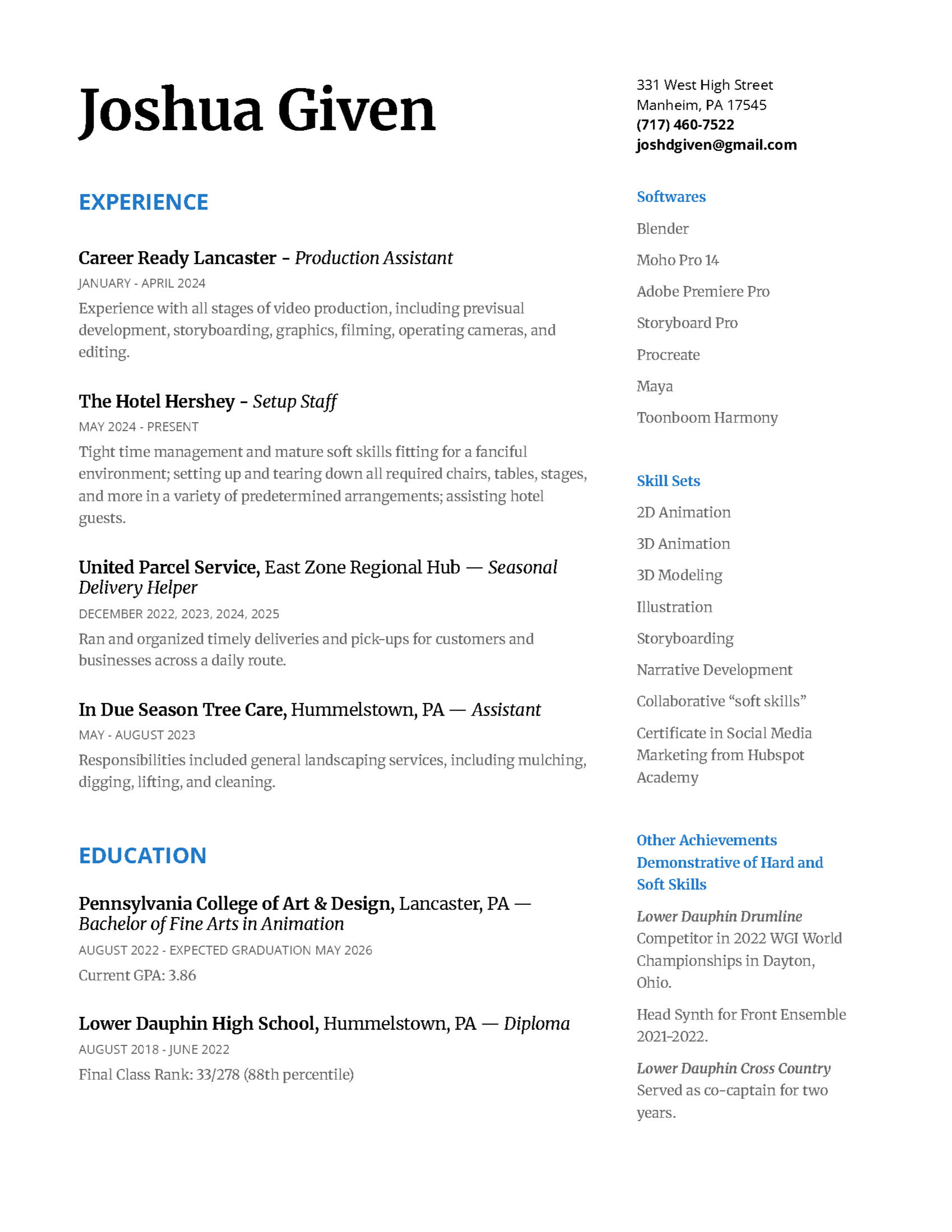 I'm Joshua Given, AKA wineskins, a current senior pursuing a Bachelor's of Fine Arts in Animation at the Pennsylvania College of Art & Design.A fresh face for the industry but no stranger to labor, my skills include 2D and 3D animation, 3D modeling, storyboarding and narrative development, and much more. I'm also familiar with alternative software programs like Blender and Moho along with standards like Premiere and Storyboard Pro.You can check out my resume below for more information. Let's get in touch!
